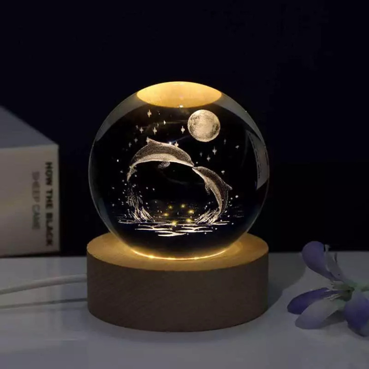 گوی کریستال با پایه چوبی چراغ دار طرح دلفین دکوری شیشه ای قیمت و خرید